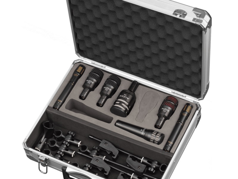 Included in the DP7 drum microphone package is the D6, Audix’s flagship kick drum microphone, two – D2 dynamic drum microphones for rack toms, one D4 for floor tom, the i5 for snare, and a pair of ADX51 studio condenser microphones for overhead miking. Also included are four D-Vice rim mount clips for the snare and tom microphones, and three heavy-duty tension fit microphone clips for the other three microphones. Everything is conveniently packaged in a foam-lined aluminum road case for safekeeping when the microphones are not in use.
