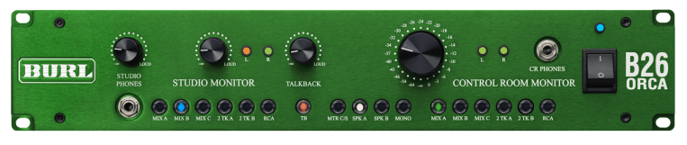 B26 Orca monitor kontrol er et typisk “centerpiece” til studiet. Med hele 6 stereo indgange og en talkback der er optimeret til SM58, Har man rig mulighed for at have referencemix eller monitorere sine hovedtelefon sends i miksrummet. Det ene sæt indgange er med RCA stik og optimeret til at sætte en computer eller telefon til, hvis man har kunder med referencer på tlf, eller lignende, alle de andre er XLR.