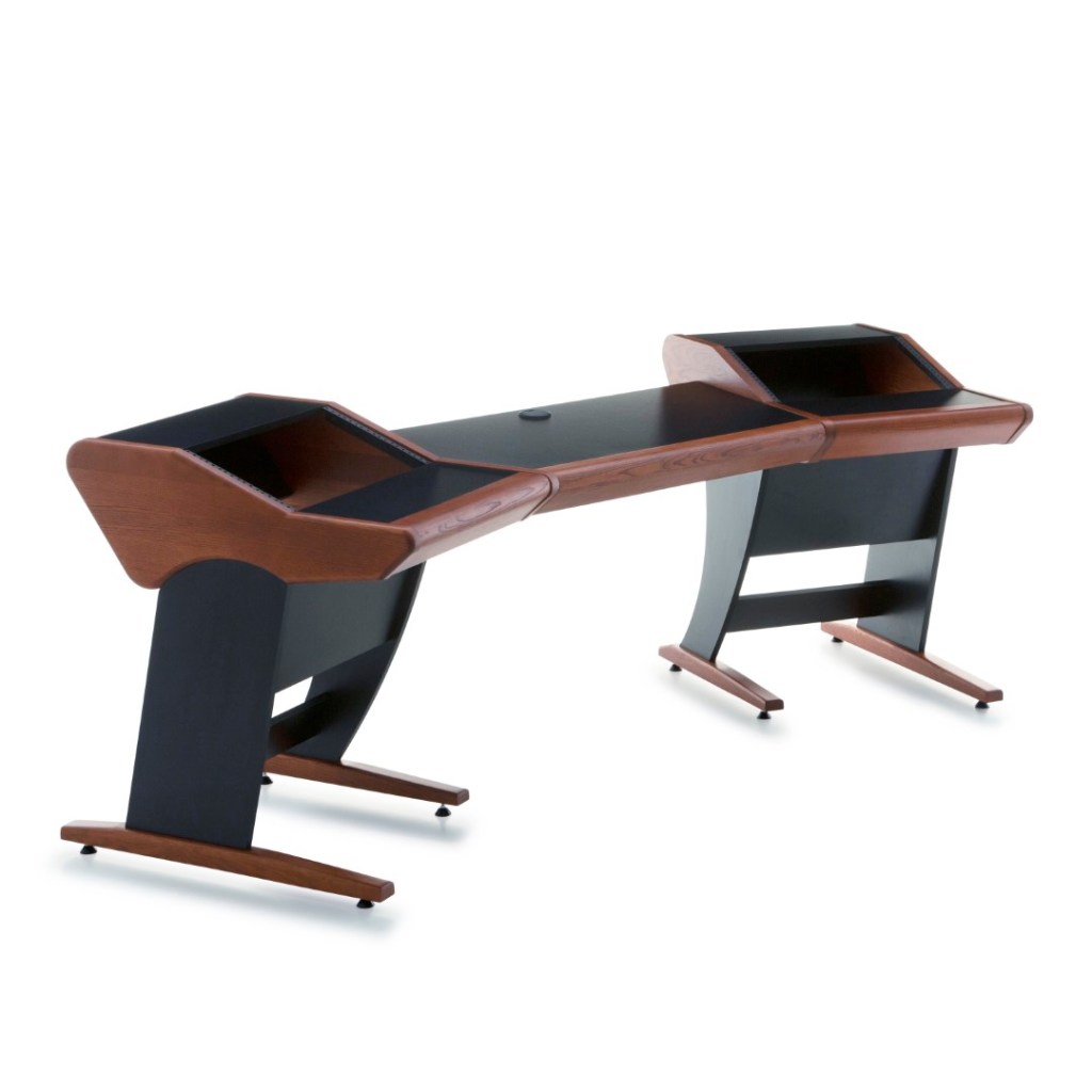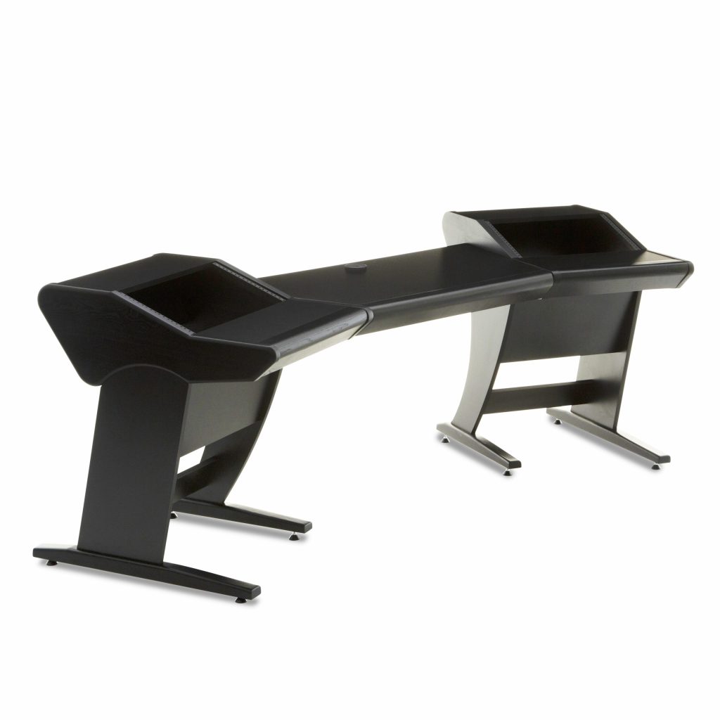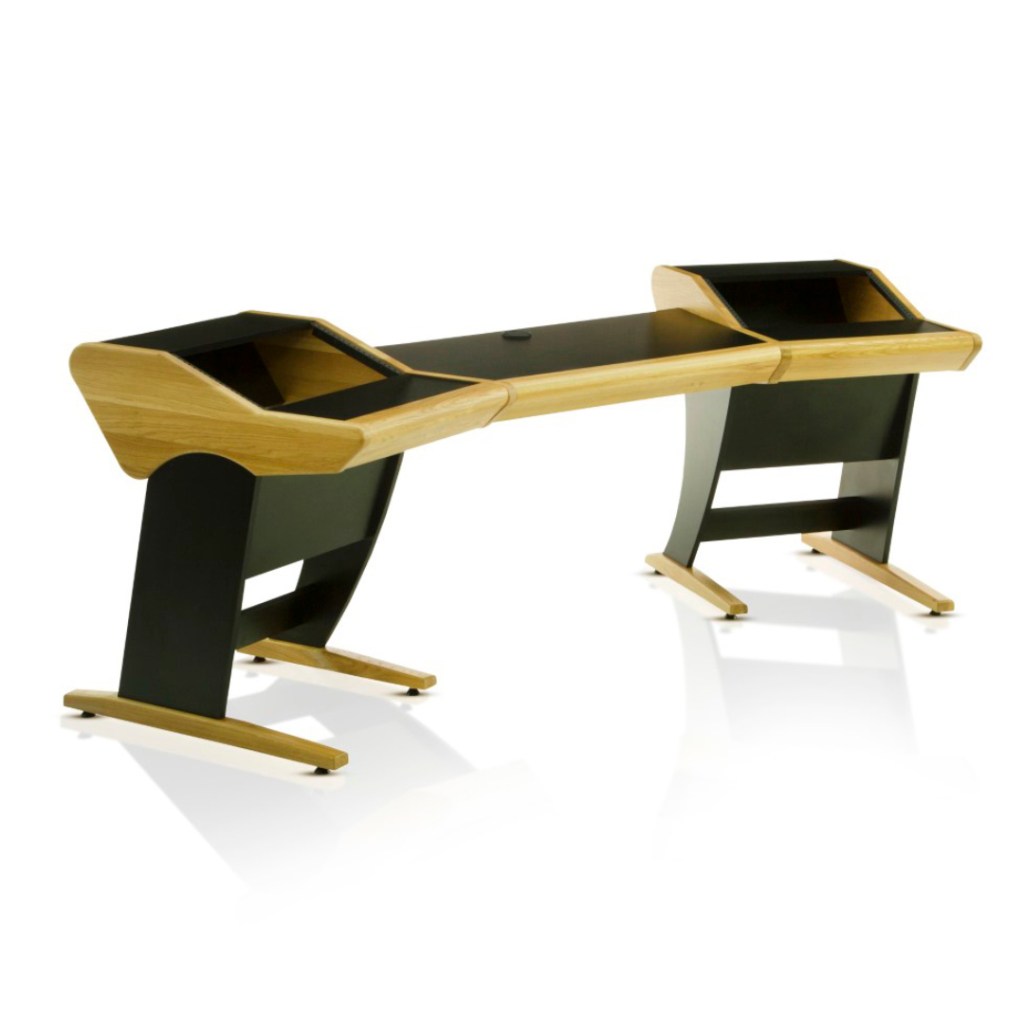 Onda is perfectly suited to the demands of hybrid studios. It offers vast amounts of desk space at its center, leaving room for DAW controllers, desktop interfaces or synthesizers in addition to the obligatory keyboard and mouse. Angled racks on each side of this central working space provide a total of twelve rack units – plenty of room for your most valued mic preamps, compressors, and EQs. And while your sound processors sit readily available and easy to reach, the desk layout still manages to keep them out of the way of your monitors, so it does not interfere with your acoustics.