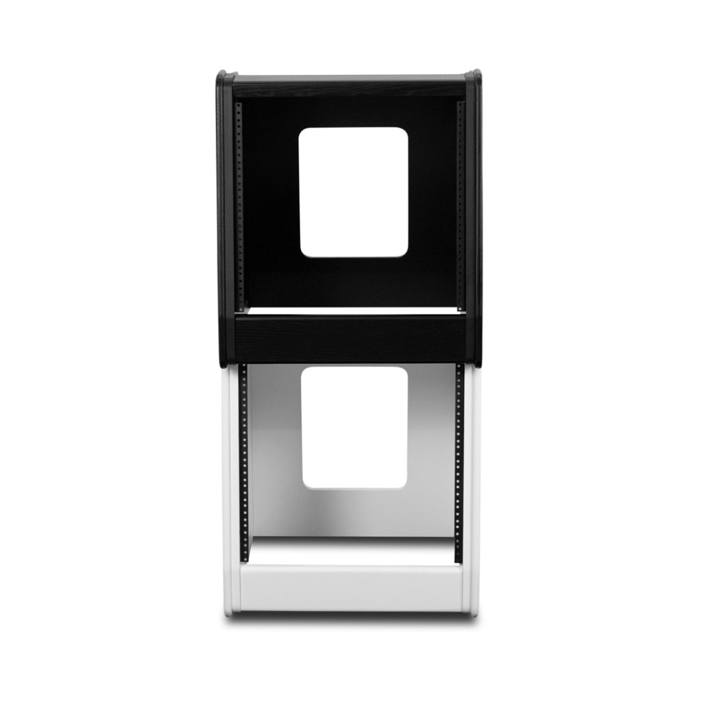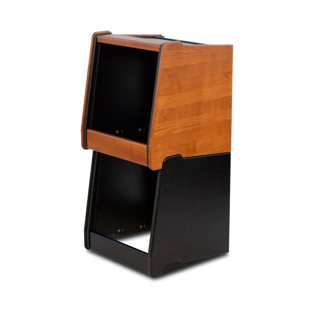 The modular Rack Roll system consists of individual side racks that offer 10 units of rack space. When your hardware collection exceeds the 10-unit allowance, now or at any point in the future, a second Rack Roll can be stacked on top of your existing setup. The two modules connect via special brackets, so they become one piece of furniture that can be moved as a whole without the risk of the upper module falling. Once the second unit is filled with precious gear, you can even stack the third unit on top, giving you a total of 30 rack units in one cleverly designed cabinet.