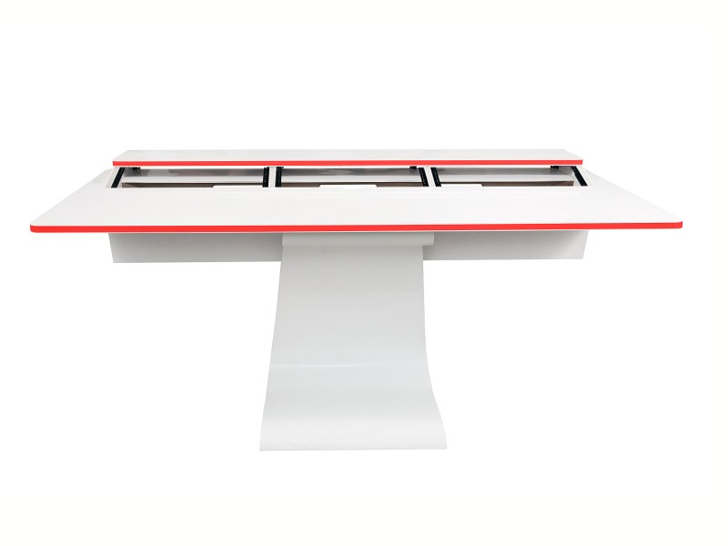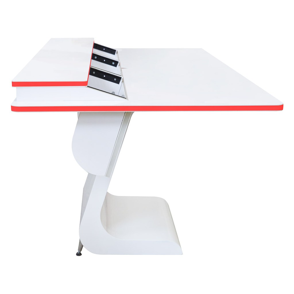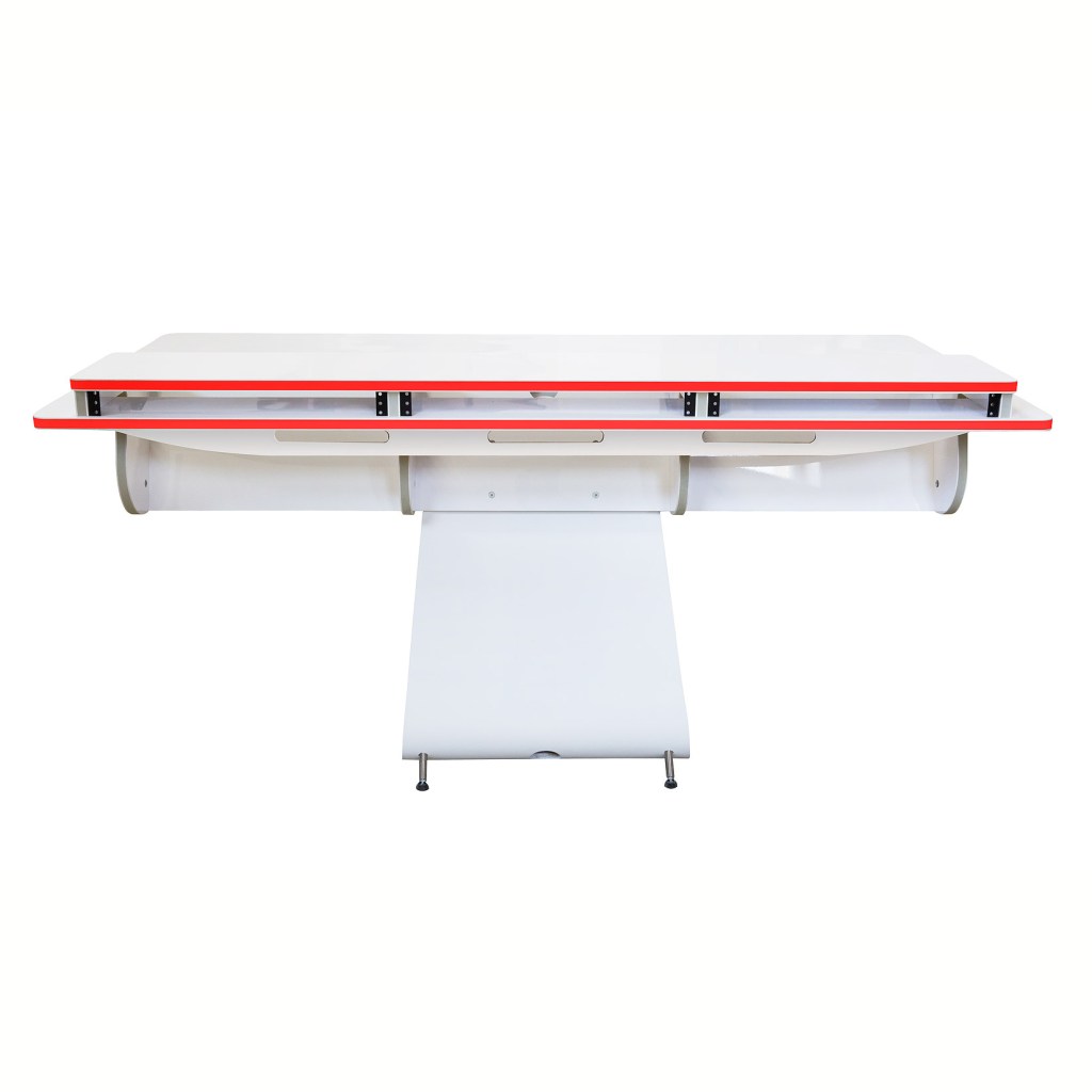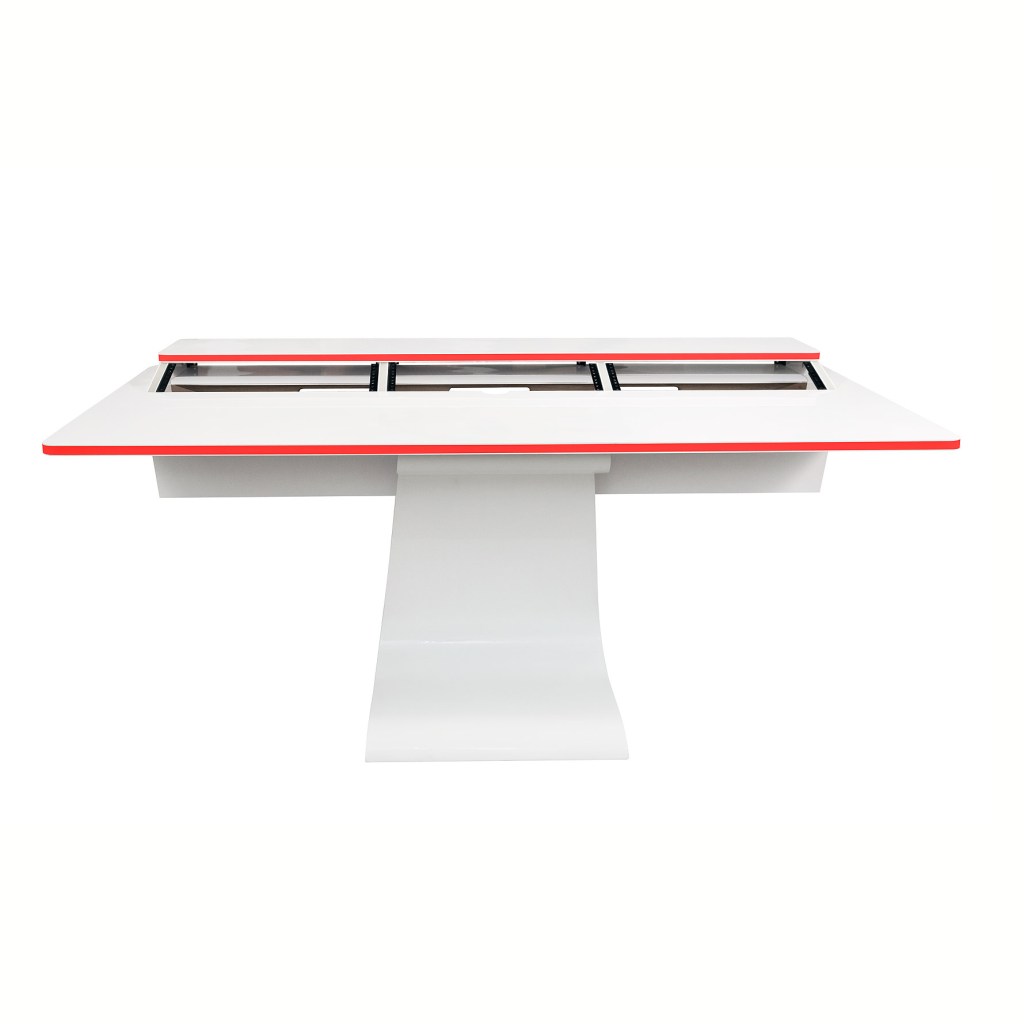 The sleek, zero-gravity design of the Vela perfectly suits the modern office with its clean lines and the burst of colour provided by the LED lights integrated into the edges. In a professional audio production studio, however, certain tools are required for efficient work. The Vela R provides the necessary rack space for those tools while retaining the almost weightless appearance of its sibling desk.