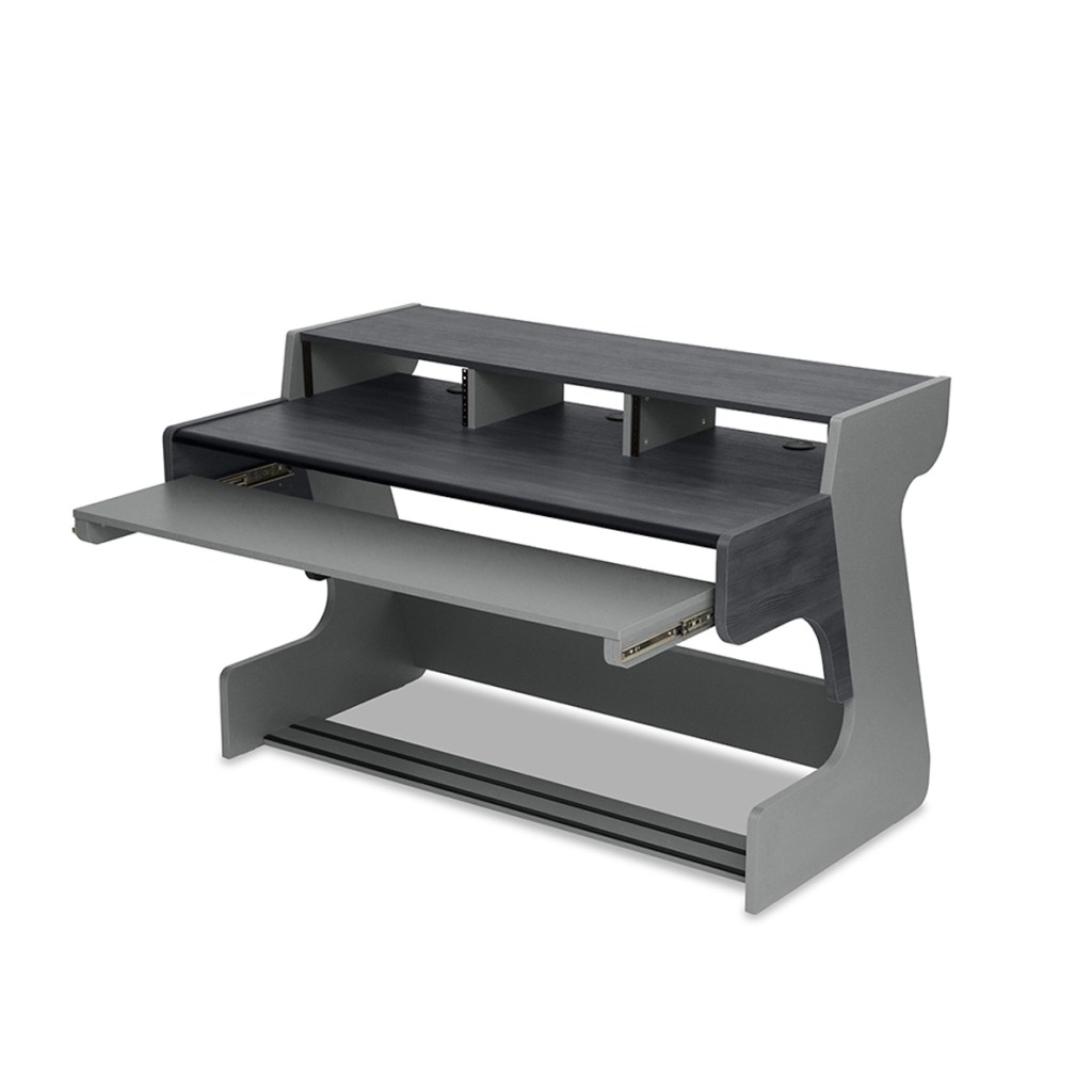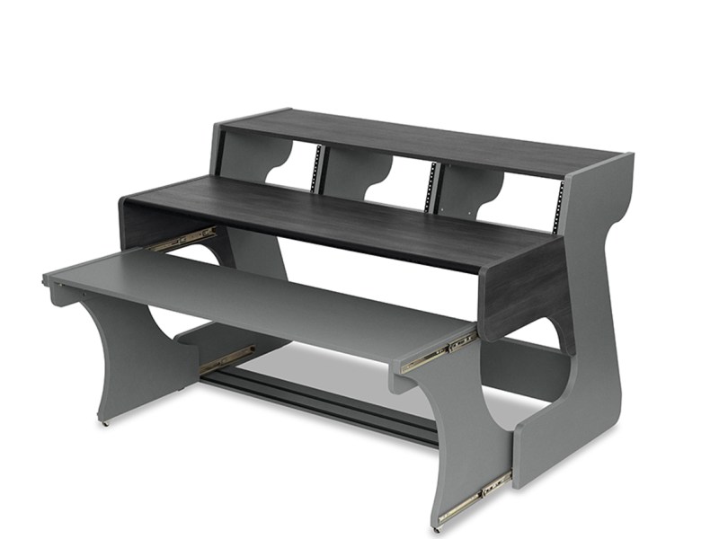 The desk designed for the computer musician: a large, height-adjustable keyboard tray, six rack units, and plenty of space for screens and periphery.