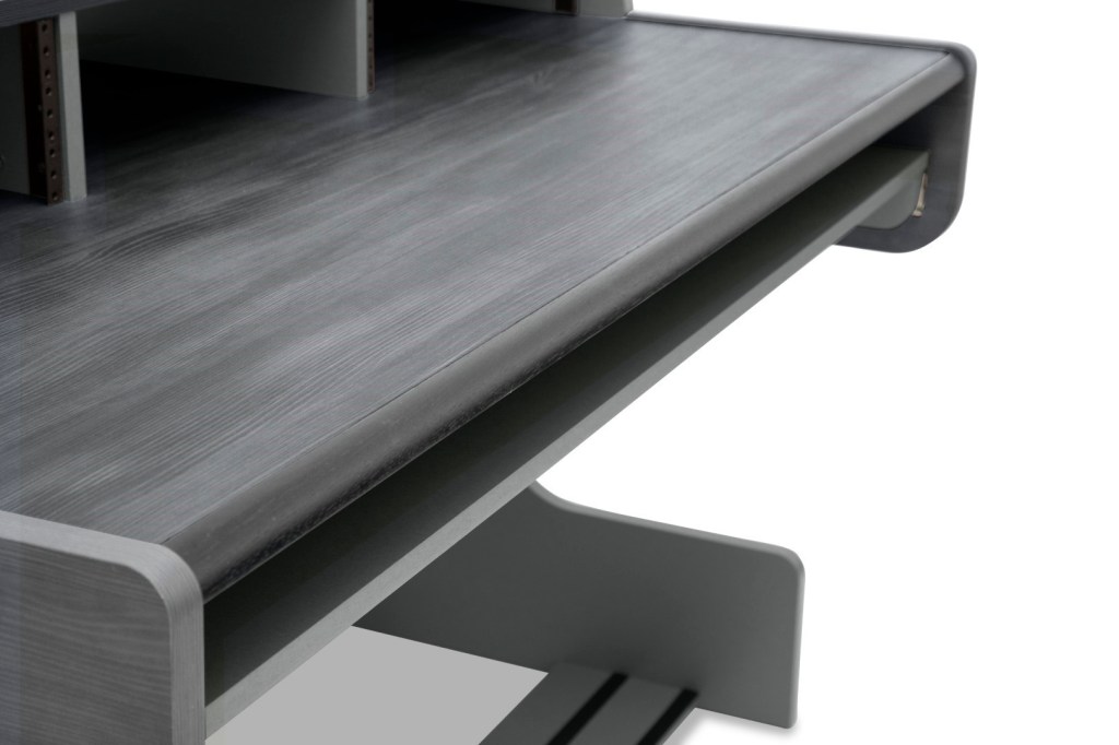 The pull-out keyboard tray can be adjusted to six different heights and holds a 76 or 88 key instrument. This new and updated version provides even more tray width for accommodating larger keyboards. Above the keyboard tray is the desk surface with room for keyboard and mouse and other desktop peripherals from small mixers to controllers. The centre of the desk offers space for the convenient and neat placement of accessories. On each side of the space, three rack units invite you to set up your 19-inch gear from sound expanders to preamps to monitor controllers. And if you do not require any rackspace, just leave out the rack rails and use the continued desk space to your liking.